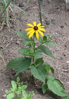 In the past couple days, a new echinacea has bloomed in my garden. I got it this spring at the Salem Eco Fair, at a local garden club's sale table. There was no label on the little plant, but it was pretty clear that it was some kind of coneflower. Now that it's bloomed, I can see that the color is sort of a golden yellow. I couldn't find a match in my rummaging around the internet, so I've posted it to the plant I.D. forum on the Dave's Garden site. Maybe someone will recognize it.